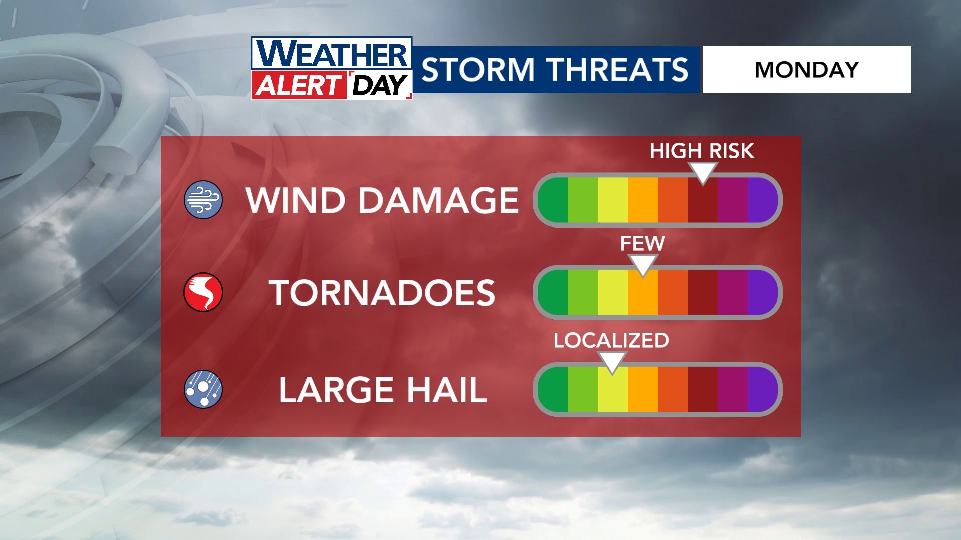 The storms could bring damaging wind gusts up to 55-75 mph. Tornadoes are a real possibility as well. While hail is possible, this would be more likely with discrete supercells and not necessarily the main line of storms.